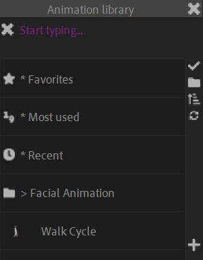 You can use the field on the top of the panel to quickly search for animations and navigate in the categories.