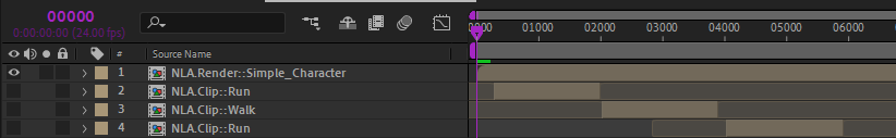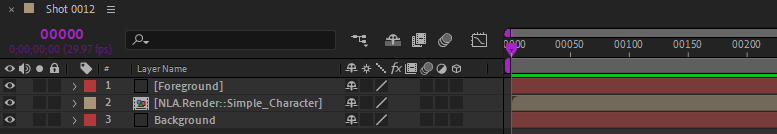 - The NLA.Clip:: precompositions must be hidden. They’re used by the NLA to generate the animation, but they’re not actually used for rendering.