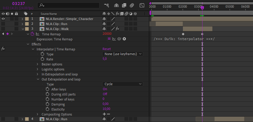 - NLA.Clip::name: Clips are the compositions containing the actual animated clips; they’re where you animate the layers, using either keyframes or expressions. There can be as many NLA.Clip compositions as you need. You can quickly create new clips from the NLA options in the Duik Animation panel.