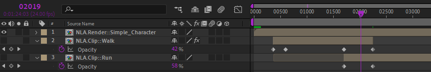 Animations can be controlled using the opacity of the the NLA.Clip:: precompositions. 100 % plays the animation as it is, 0 % deactivates it, and values in between multiply the values, effectively weighting the animations. This can especially be used to animate transitions between clips, for example to transition between a standing pose and a walk cycle, and then from a walk cycle to a run cycle. This works exactly as if you were animating a crossfade between video clips, except that the NLA doesn’t actually animates the opacity but really animates the transition of all animated properties between the animated clips.