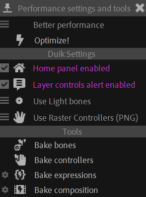 Duik provides a popup panel to gather all performance settings and tools at the same place, to help you define the best settings to improve performance. It also provides a smart optimizer which will adjust some settings and switches to quickly improve the performance of the current composition.