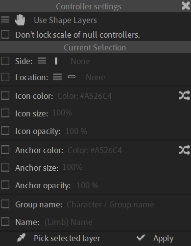You can use the other controller settings to change the appearance of the selected controllers. The Pick selected layer button will pick all values from the selected controller to easily apply the same settings to other controllers.
