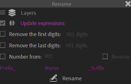 With the Rename tool you can rename as many layers, puppet pins or project items at once as you wish.