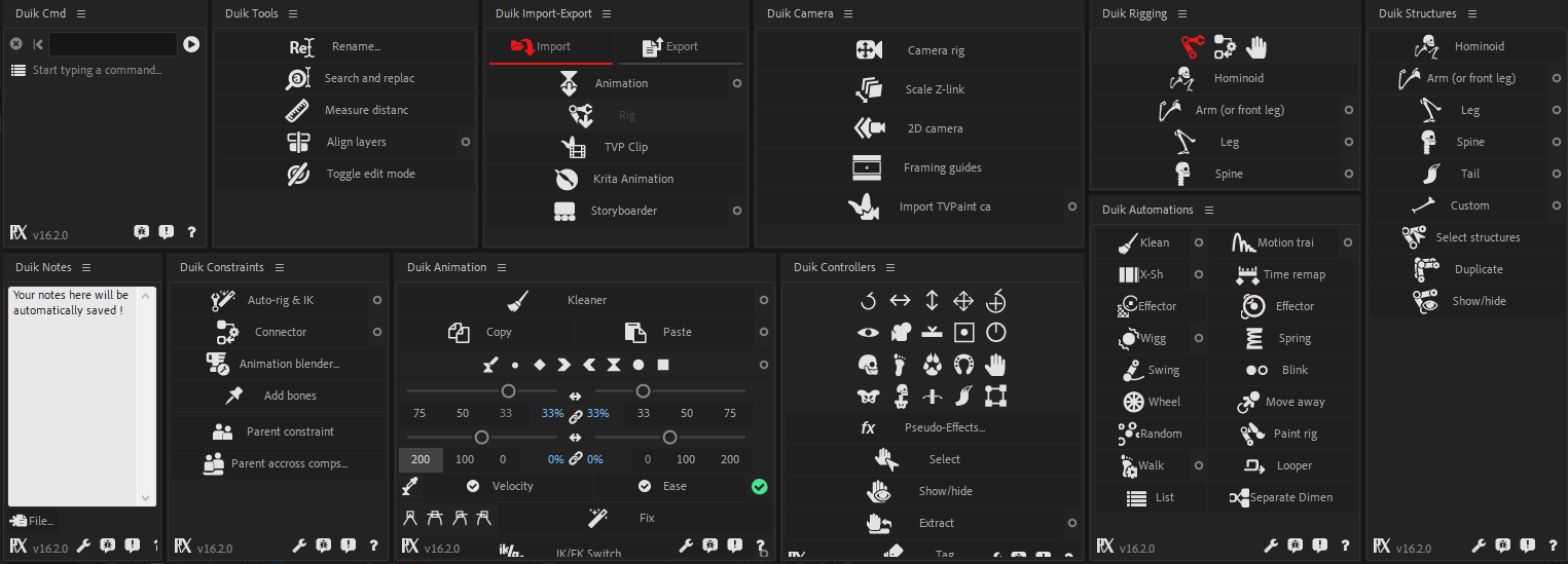 Among these individual panels, you’ll also find a special one, the Duik Cmd panel…