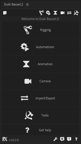 The RX icon opens the Rainbox Lab. website where you can find useful information about Duik and other tools.