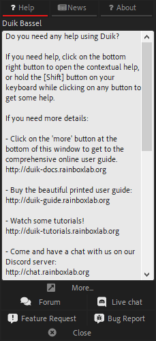 With very rare exceptions, everything Duik needs to display will be displayed in its main panel or small pop-ups (with the exception of the Help Panel, which needs to be visible at any time), it won’t use dialogs and other windows, so you know where to find information, and you’re not distracted by pop-ups. Also, there are no blocking windows (what’s called Modal Dialogs), to keep an agile workflow. - Keep the UI as small as possible