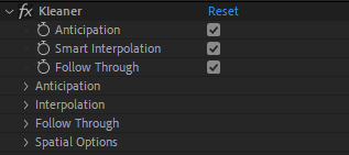 Overlap/drag: This is another important animation principle: each property moves a bit after its parent. When this option is enabled, the Kleaner will adjust the movement of the spatial properties according to the movement of the parents of the layer, so they will have some overlapping motion. You can set the duration of this overlap.