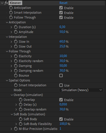 Soft Body: when this option is enabled, the Kleaner automatically adjusts the follow-through parameters and the overlap duration of the spatial properties according to their distance to the anchor point of the layer. This means there’s a short overlap between the spatial properties and the layer itself, and their elasticity will be a bit lower. This can be adjusted with the flexibility slider.
