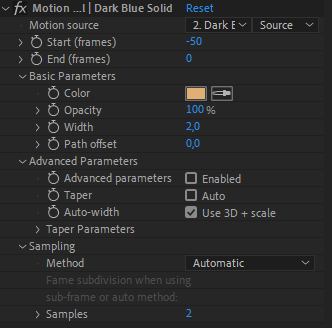 By default, the motion is sampled each frame of the composition. If the movement is very fast, you might want more samples for a smoother trail. In this case, you can switch to Automatic sampling which will try to adjust depending on the velocity and choose the best sampling while trying to keep better performance, or sub-frame sampling which is the calculation-intensive way to sample the motion. In Automatic and sub-frame sampling you can adjust the number of samples, which directly impacts the quality of the trail but can have a big impact on performance, too.