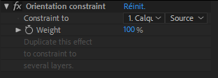 - Select a layer and click on the Orientation Constraint button. An effect is added on the layer to let you select the constraint and set its weight to adjust the influence.